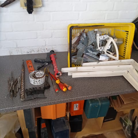 Forskellige stykker værktøj. Skruer og beslag.