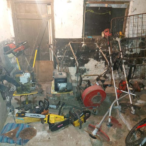 Samling af havemaskiner og udstyr. På billederne ses blandt andet en højtryksrenser, en kædesav og forskellige håndredskaber til havearbejde. Velegnet til generelle opgaver i have og udendørsarealer som rengøring, beskæring og vedligeholdelse. Yderligere specifikationer fremgår ikke af billederne.