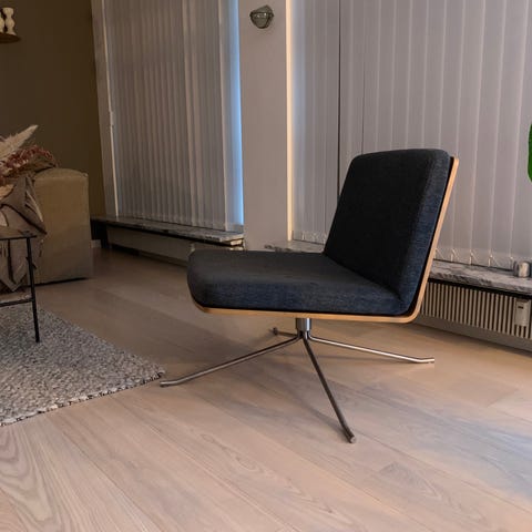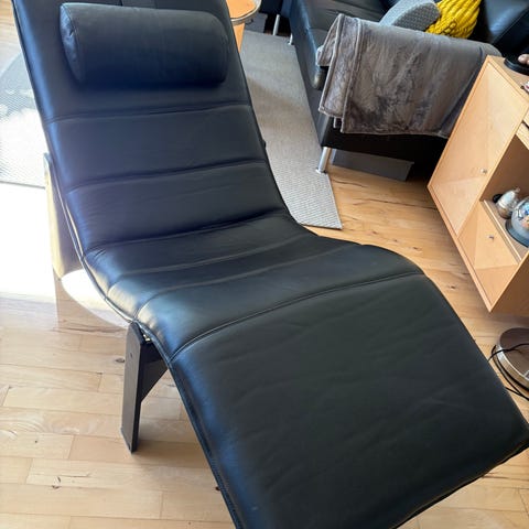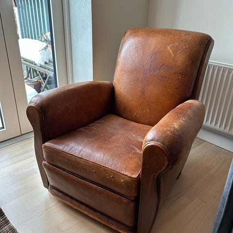 Super lækker læder lænestol med stilnen inspireret af PK22 stolen .