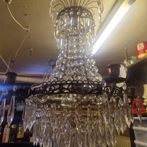 En gammel og meget tung prismelysekrone, der mangles nogle prismer, men er virkelig flot