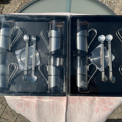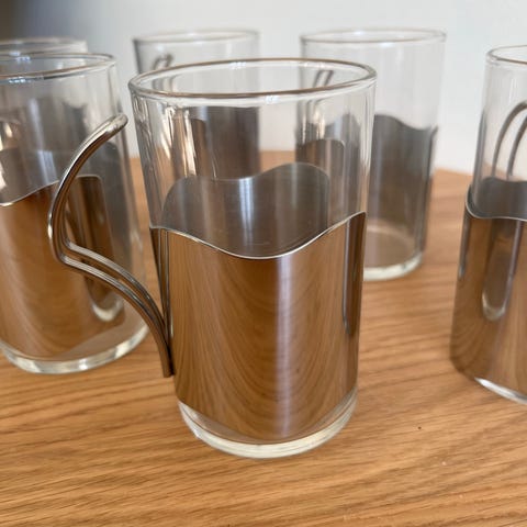 Glas til varme drikke - Teglas, krus med håndtag og bakker i rustfrit stål , 4 sugerør, alle i fin stand, højde 13,5 cm diameter 6 cm