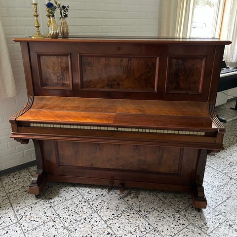 Klaveret er bygget i mahogni. Er hovedrepareret i Pianoværkstedet Mattsson & McGehee.