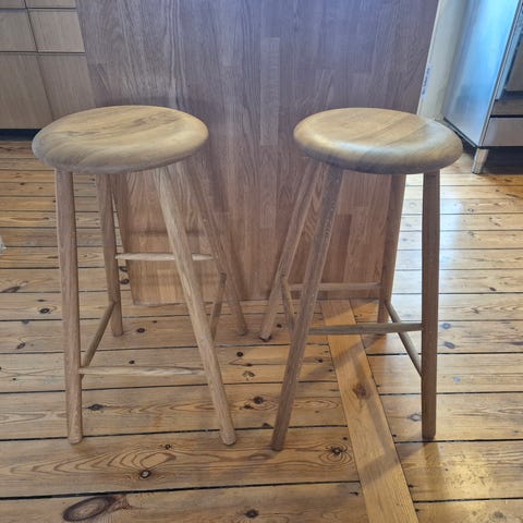 Sælger 2 flotte barstole/køkkentaburetter i massivt eg.