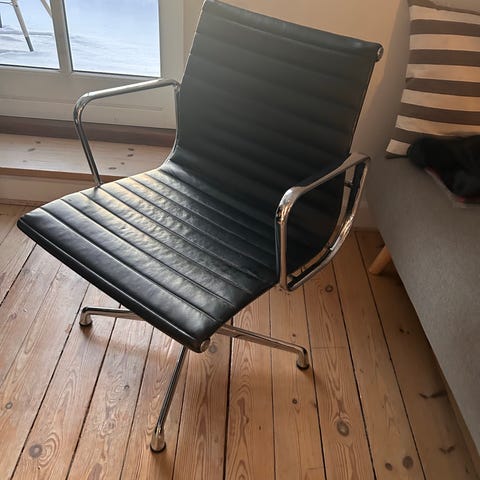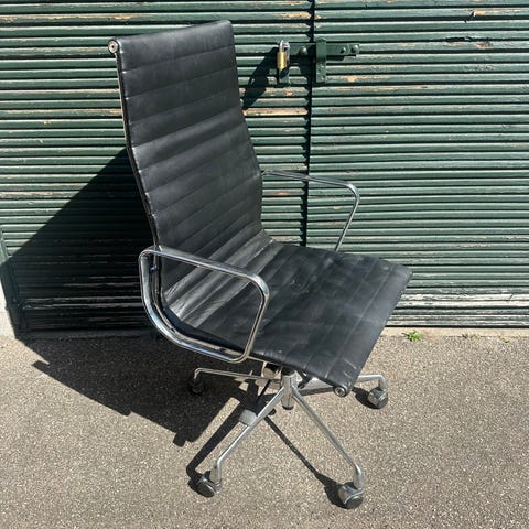Kontorstol/Skrivebordsstol med betræk af sort læder,stel af forkromet aluminium,på fempasfod med hjul.