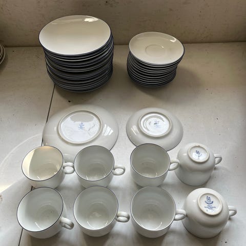 Bavaria Tirschenreuth stel fra Tyskland, dekoreret i Danmark af Bucha & Nissen. Lys grønlig nuance med guldkant.