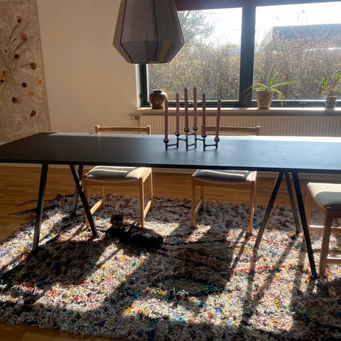 Bordet har en del hakker efter flytning. Bordben og støtte stand fejler ikke noget. Bordpladen kan evt. skiftes.