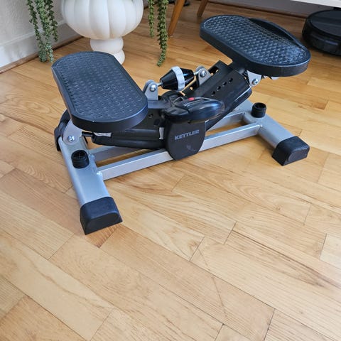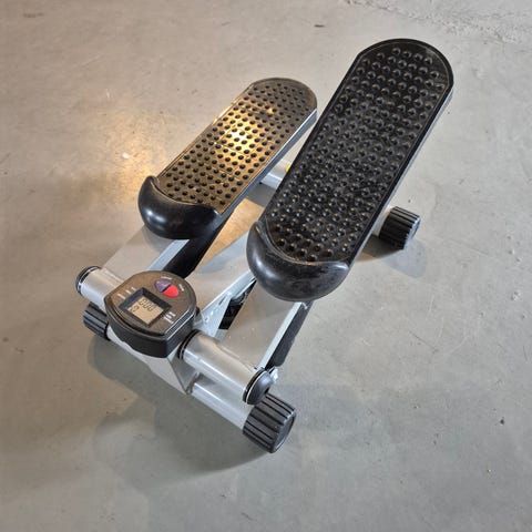 STS GS mini stepmaskine med træningscomputer. Kompakt steptræner med to skridtplader og skridsikre overflader. Udstyret med elektronisk display, der kan vise tid og skridttæller (counter), samt start/stop- og reset-knapper. Modstanden kan justeres via drejeknap med plus- og minusmarkering. Egnet til hjemmetræning af ben og kondition.