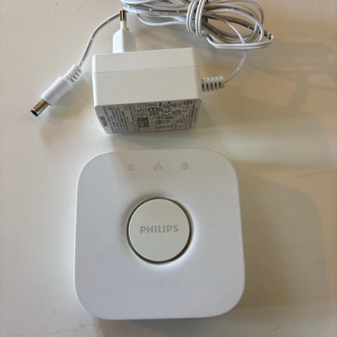 Philips Hue Bridge 2.1 netværkskomponent i hvid. Enheden fungerer som central styringsenhed til Philips Hue belysningssystem og tilsluttes hjemmenetværket via netværkskabel. Har netværksport (RJ45) og strømtilslutning samt medfølgende strømadapter med stik til almindelig stikkontakt. Bruges til at forbinde og styre kompatible Philips Hue pærer og tilbehør gennem netværket og relevante apps eller systemer.