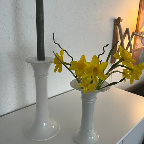 Der er 2 glas vaser/stager i original embalage. Jeg har to pakker. De er meget dekorative.