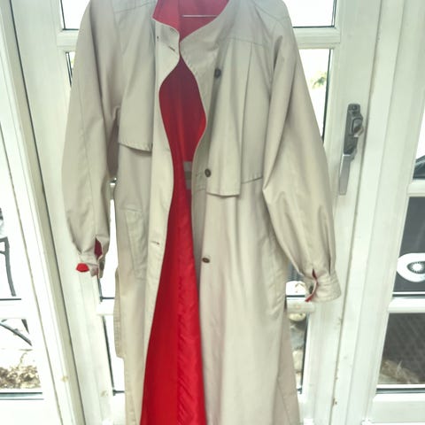 & Other Stories uldjakke til kvinder i størrelse L. Jakken er rød og fremstillet i uld. Den har lange ærmer, bred krave og lukkes i siden med en dekorativ lukning. Modellen går cirka til hofterne og har en let A-formet pasform. Velegnet som overgangsjakke eller let overtøj i køligere vejr.