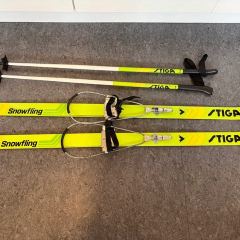 Stiga Snowfling langrendsski 120cm. med tilhørende stave (90 cm.). Skiene har justerbare kabelbindinger, der fastgøres omkring støvlen, og kan varieres i strørrelse 28-35. Smøre- og voksfri. Lille skade på den ene stav. Se billede.
