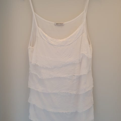 3: Hvid top med glimmer palietter og ”flæser”. Mrk. Creme Fraiche. Str. M/L- Materiale 100 % Seta – Soir/Silk Seda. Nypris 149 kr.