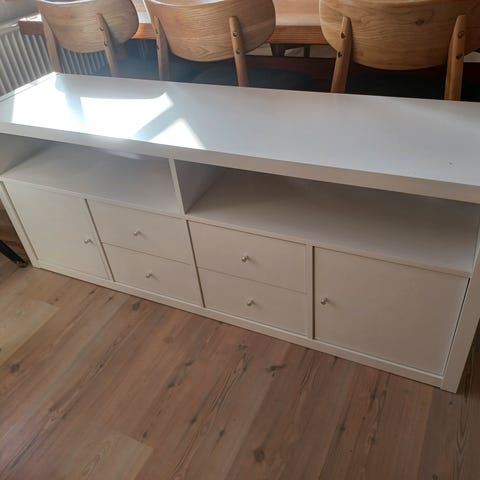Fin, hvid NORDLI kommode fra ikea der har været brugt som opbevaring under en seng og derfor har et par småskrammer på oversiden, men som man ikke bemærker når den står. Vi kan hjælpe med at bære den ned fra 5. Sal. Den kan skilles lidt ad. Nypris 1850.