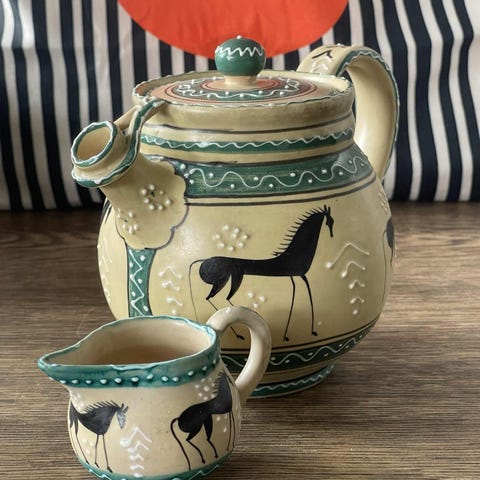 Ca. 3 liter. Keramisk tekande. Kanden er udført i brændt ler med mat, brunlig og grøn glasur. Låget er grønt med en lille, siddende kvindelig figur. Tekanden har rund krop, markant tud og håndtag. Der er tesi i tuden.