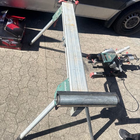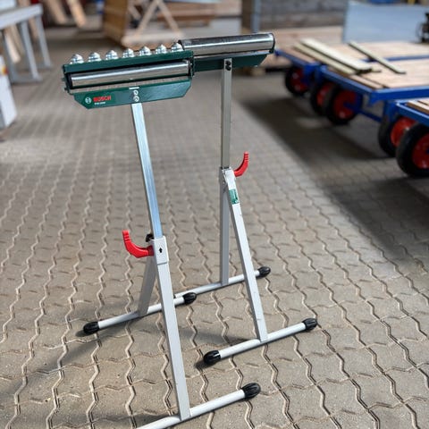 Rullestativ til savbord i metal. Stativet har sammenklappelige ben og ruller i metal i begge ender, som kan støtte og føre lange emner ved savning eller anden bearbejdning. Egnet til brug i værksted eller på byggeplads som støtte til fx kap-/geringssav eller andre stationære maskiner. Farven er sort med metalruller.