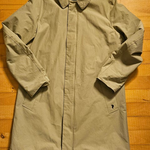 Tommy Hilfiger frakke til herre i størrelse L. Frakken er beige og fremstillet i bomuld. Klassisk model med krave og knaplukning foran. Ærmerne har stropper ved manchetterne. Indersiden har stribet foer ved øverste del. Egnet som let overtøj i overgangsvejr.