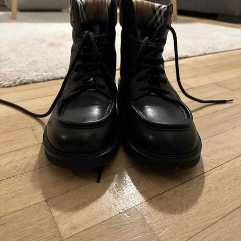 Hugo Boss støvler i størrelse 44. Støvlerne er i sort læder med snørelukning og kraftig gummisål. Klassisk ankelhøj model, velegnet til hverdagsbrug i køligere vejr. Passer typisk til herre, men kan også bruges unisex afhængigt af pasform og stil.