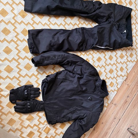 Meget lidt brugt og pænt Rev’it motorcykeljakke og bukser sæt i tekstil. Størrelse XXL. Jakken er sort med neongule paneler og refleksdetaljer for øget synlighed i trafikken. Bukserne er sorte med forstærkede områder. Sættet er forsynet med Hydratex G-liner, som giver vandtætte og vindtætte egenskaber kombineret med åndbarhed. Egnet som køredragt til motorcykelbrug i skiftende vejrforhold.