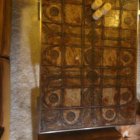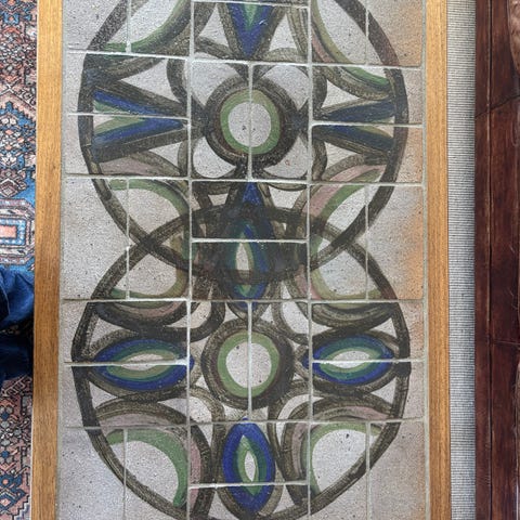 Sofabord med ben i rustfrit stål med rektangulær bordplade i keramisk mosaik. Ukendt designer og producent.