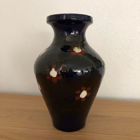 Keramikvase fra Danmark i brun glasur med blå dekoration. Vasen har rund, kugleformet krop og smal hals. I bunden ses stempel med Hans Kahler. Vasen har et lille bitte skår i toppen.