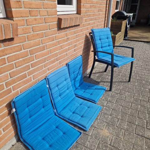 4 have hynder i gul og hvide striber. Der er lidt mug på to af hynderne. Men ellers er de i god stand. De er fra jysk og har kostet 75 kr. pr. Stk. hynderne kan vendes, tynde striber på den ene side og brede på den anden side