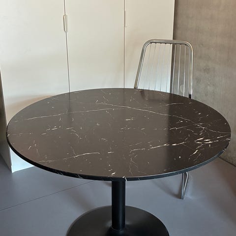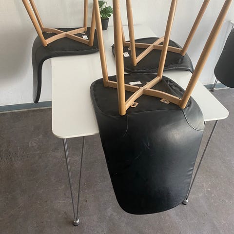 Brugt spisebordssæt med 3 stole og et sort rundt bord. Der er lidt tydelige brugstegn på bordet og stolene.