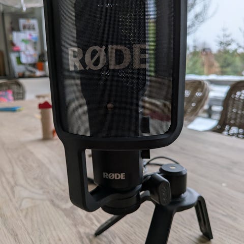 Røde NT1-A mikrofon er en stor-membran kondensator-mikrofon i sølvfarve. Sættet på billederne inkluderer bordstativ, elastisk shockmount og popfilter med Røde-logo samt opbevaringspose. Mikrofonen er velegnet til optagelse af tale og vokal i hjemmestudie, podcast eller lignende lydoptagelser, hvor der ønskes detaljeret og klar gengivelse af stemmen.