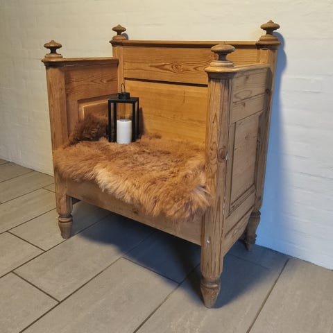 Gammel flot afsyret træbænk med opbevaring i sædet. Sælges for 300 kr. Målene er 97 cm i bredden, 112 i højden og 53 i dybden. Skal afhentes i sommerhus nær Nykøbing Sjælland.