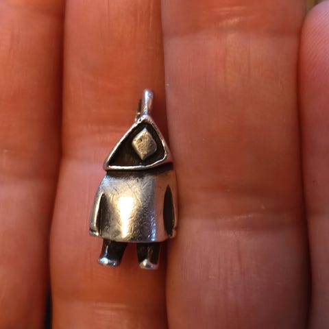Den søde lille Thulemand er ca. 2 cm høj og stemplet GF (Grønland-Forsyning - Grønland 1982 - 2005) Sterling. Kæden på 52 cm er stemplet 830S og utydeligt mestermærke. Kæden kan ikke komme ud af øsken, med mindre man klemmer den lille ring, så det har jeg ikke gjort.