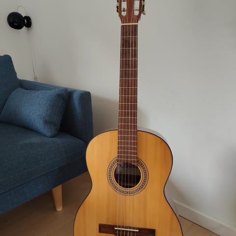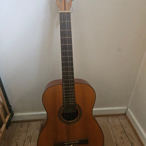 Herman Carlson Levin akustisk guitar i klassisk parlour-størrelse. Kroppen er udført i træ med naturfinish på forsiden og mørkere finish på bagsiden. Guitaren har seks strenge, slotted headstock og mekaniske stemmeskruer i metal. Velegnet som akustisk guitar til spil i hjemmet, øvelokale eller som samlerobjekt fra Herman Carlson Levins musikinstrumentfabrik i Göteborg.