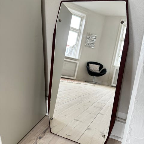 Fint spejl med ramme i teaktræ. Fremstår fint og velholdt.