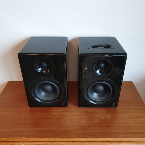 Argon Forte A5 højttalere i sort finish. Aktivt højttalersæt med indbygget forstærker i den ene højttaler og passiv medhøjttaler. Bagsiden har flere tilslutningsmuligheder, herunder analoge RCA-indgange. Egnede til brug sammen med f.eks. tv, computer eller anlæg i stue eller kontor, hvor der ønskes et kompakt stereosystem med separate højttalere.