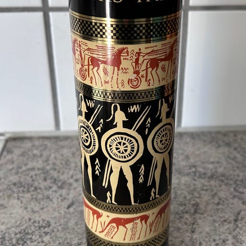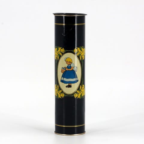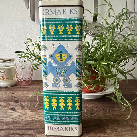 Irma kiksedåse med låg i metal. Retro Cylindrisk beholder i mørkeblå med dekorativt motiv af Irmapige i blå kjole samt gule blomster på siderne. Låget er rundt med trykt motiv i gul farve. Dåsen kan anvendes til opbevaring i køkkenet eller andre steder i hjemmet. Sælges 176,-kr
