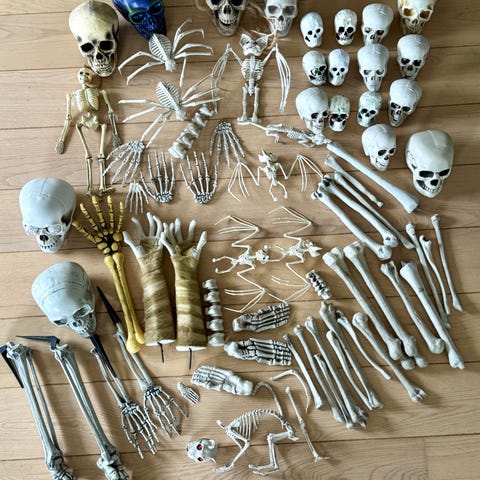 Halloween pynt med flere figurer i form af skeletter og dukker i forskellige udformninger. Sættet består af flere løse figurer med tøj i blandede farver, blandt andet grøn, sort, hvid og stribet. Egnet som dekoration til halloween eller andre temafester, hvor der ønskes uhyggelig stemning. Kan bruges til ophæng eller som liggende pynt på gulv, bord eller i dekorationer.