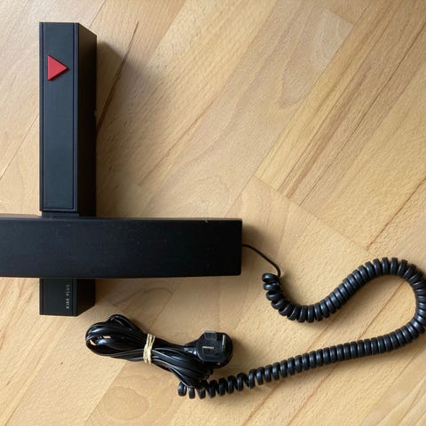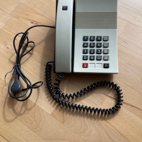 Fastnettelefon med håndsæt i sort plast, spiralledning og separat baseenhed. Håndsættet har numerisk tastatur på forsiden samt højtaler og mikrofon i hver ende. Vægophænget har en diameter på 7,5 cm. Telefonrøret har en længde på 22 cm.