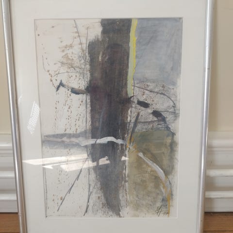 Abstrakt kunstværk billede i lyse og mørke nuancer, indrammet i rektangulær ramme med gylden kant. Motivet består af geometriske former og linjer i lag, udført på papir. Kunstværket er signeret nederst og dateret, og er monteret med lys passepartout.