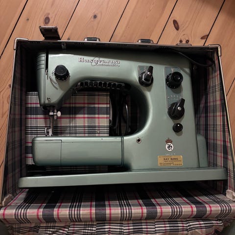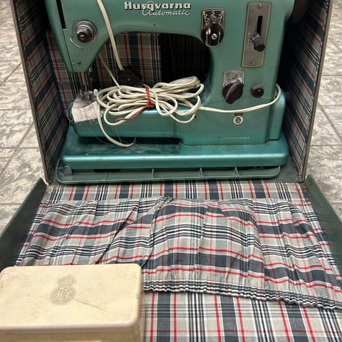 Husqvarna 19A symaskine i transportkuffert. Mekanisk symaskine i grøn farve med betjeningsknapper på fronten. Maskinen leveres i hård kuffert med håndtag og metalbeslag. Der medfølger brugsanvisning til Husqvarna 19A samt indvendig opbevaringsbakke i kufferten til tilbehør. Velegnet til almindelige syopgaver i hjemmet og som robust, ældre husholdningsmaskine.