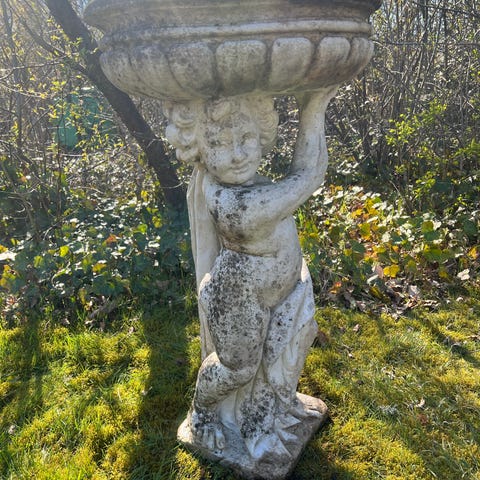 Havefigur fuglebad og to englefigurer i stenlook. Sættet består af et fritstående fuglebad med rund skål øverst og søjleformet fod dekoreret med figurer, samt to mindre fritstående englefigurer. Materialet fremstår som støbt sten eller beton med hvidt stenlook. Velegnet som dekoration i have, på terrasse eller altan.