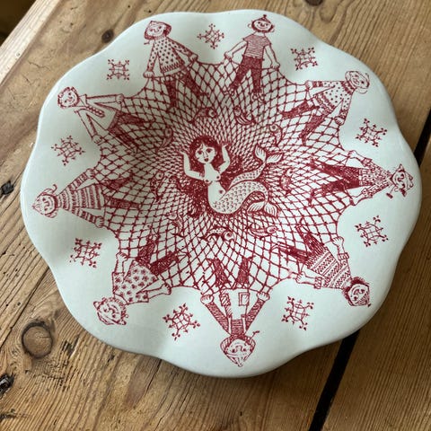 Fyrfadsstage med motiv af Bjørn Wiinblad i rødt.