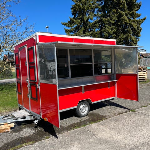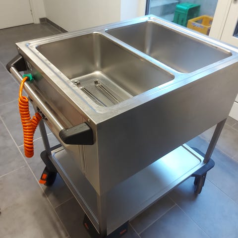 Hjemmelavet mobil vogn til at sælge brændte mandler. I rustfrit stål. Der medfølger metal bakke og gryde. Der mangler en brænder.