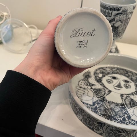 Nymølle. Grøn skål et lille skår I låget og store vase en revne indvendigt men holder tæt. Bud modtages.