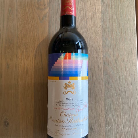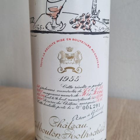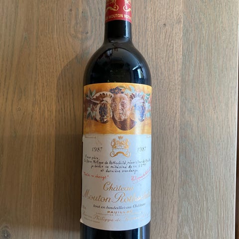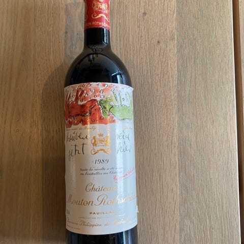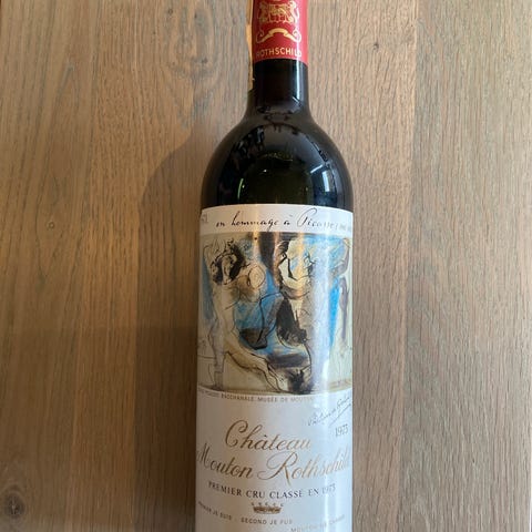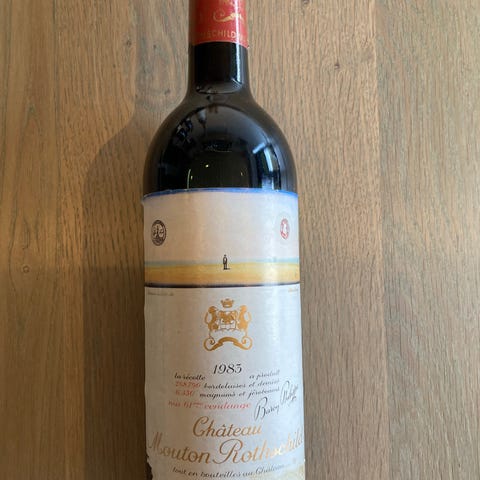 Château Mouton Rothschild rødvin i flaske. Klassisk fransk rødvin fra Bordeaux-området. Flasken har original etiket og kapsel med slottemblem. Velegnet til samling eller servering ved passende lejligheder. Årgang 1988.