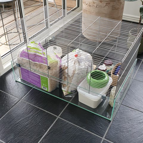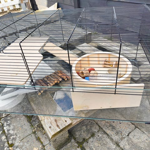 Træ bur til hamster med glasfront og flere niveauer. Buret har flere etager forbundet med ramper, så dyret kan bevæge sig rundt. Fronten er i glas, hvilket giver godt udsyn til indersiden. Der er trådnet i toppen for ventilation. Indvendigt er der forskellige tilbehørsdele som løbehjul, huse, rør og platforme, som kan bruges til f.eks. hamster eller andre små gnavere. Velegnet som indendørs bur, hvor der er plads til bundstrøelse og indretning efter behov.
