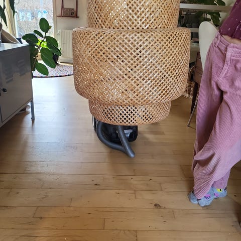 2 IKEA lamper i bambus. Diameter: 50 cm. Ledning: ca 1,5 meter med sort baldakin.