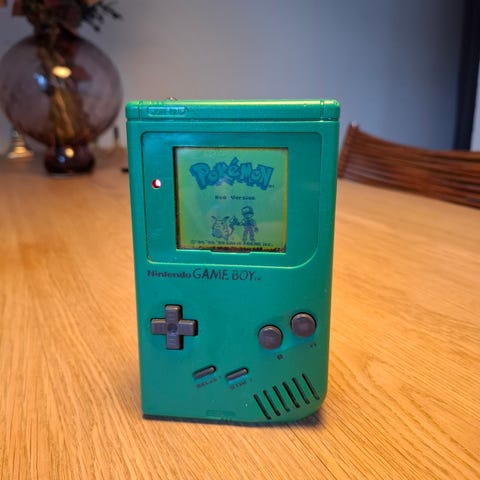 Nintendo Game Boy-konsol i transparent "atomic purple" farve, testet og fungerer perfekt (rensede kontakterne indvendigt). Jeg har også 4 spil og en original Pokémon-taske. Her er priserne: