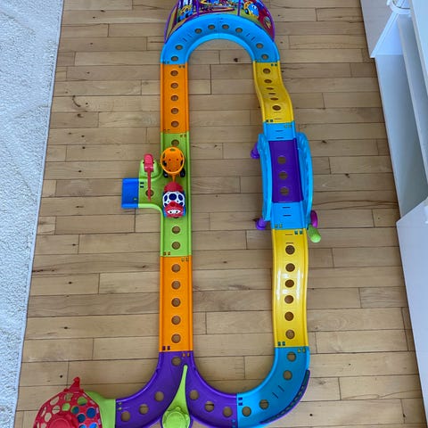 Fisher-Price legebane med biler. Sættet består af en farverig bane med flere elementer og tilhørende små biler i plast. Legetøjet er egnet til mindre børn og kan bruges til leg med kørsel, løb og simple banekonstruktioner. Bilerne kan køres rundt på banen og bruges til rolleleg og træning af finmotorik.