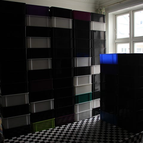 100stk klodskasser. Størstedelen er sorte men der er også enkelte i andre farver.