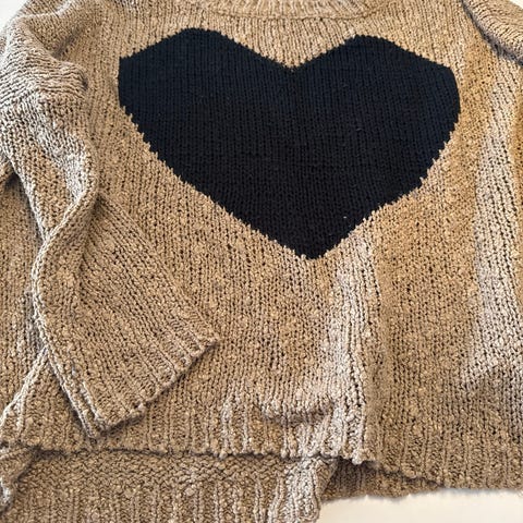 Toppen er beige og strikket i akryl og uld med et groft, åbent maskemønster. Kortærmet model, der kan bæres med en top eller bluse under.