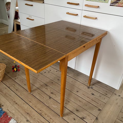 Solidt bord, snedkerarbejde, 130 cm i diameter, der er en ekstra plade. Trænger til at blive slebet og malet, men har mange år endnu i sig.