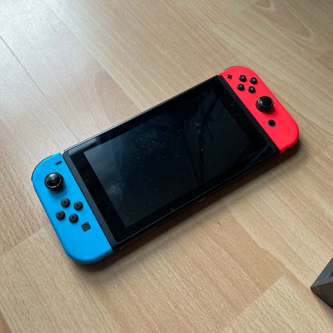 Nintendo Switch konsol med aftagelige Joy-Con controllere i rød og blå. Sættet omfatter selve Switch-konsollen med skærm, Joy-Con venstre og højre, Joy-Con greb, Joy-Con håndledsremme, dock til tilslutning til tv samt strømforsyning og kabler som vist på billederne. Der medfølger desuden et etui til opbevaring og et spil i fysisk udgave som vist. Konsollen kan bruges både håndholdt og til spil på tv via docken. Skærmen har haft beskyttelse filtrer på altid
